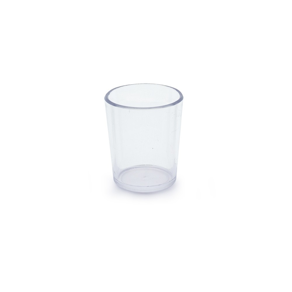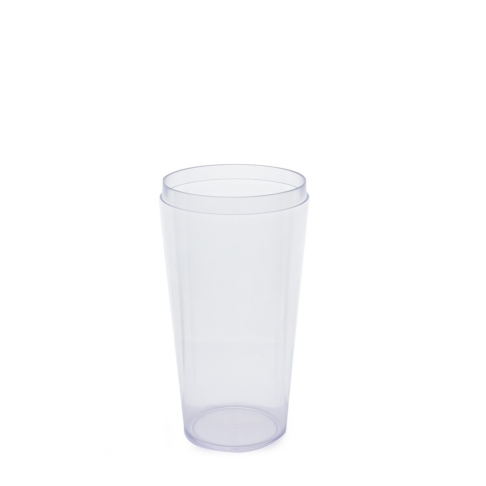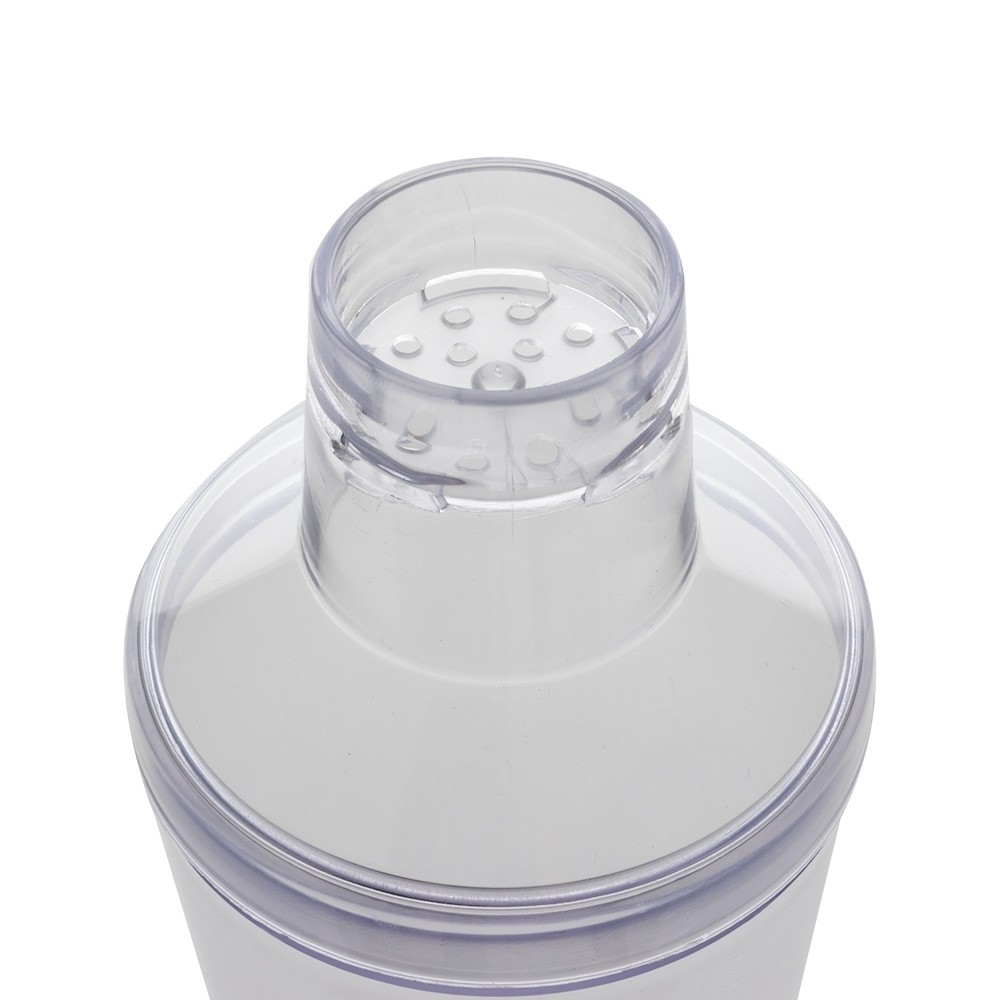 Coqueteleira de acrílico com capacidade de 560ml, possui tampa de encaixe com peneira e um copo pequeno utilizado como tampa.
