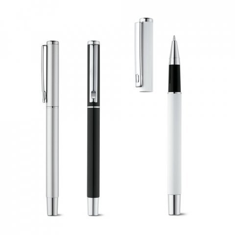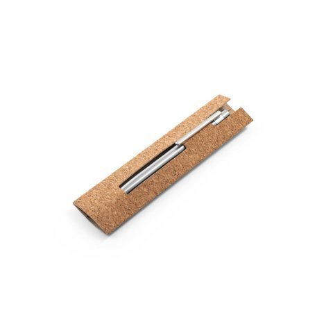 Esferográfica com corpo em aço inox 53% reciclado. A esferográfica tem clipe, mecanismo twist e escrita em azul até 1,5 km. Fornecida numa bolsa presente de cortiça. Esferográfica: ø11 x 133 mm | Bolsa: 155 x 40 mm