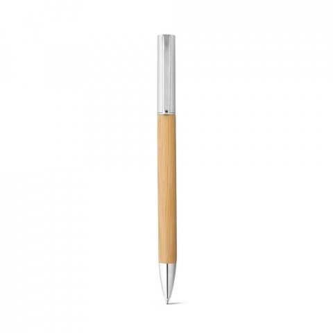 Esferográfica em bambu e ABS com acabamento metálico mate. A esferográfica tem clipe em metal, mecanismo twist e escrita em azul. A cor e o resultado da impressão nos materiais naturais pode variar entre produtos. Ø10 x 142 mm