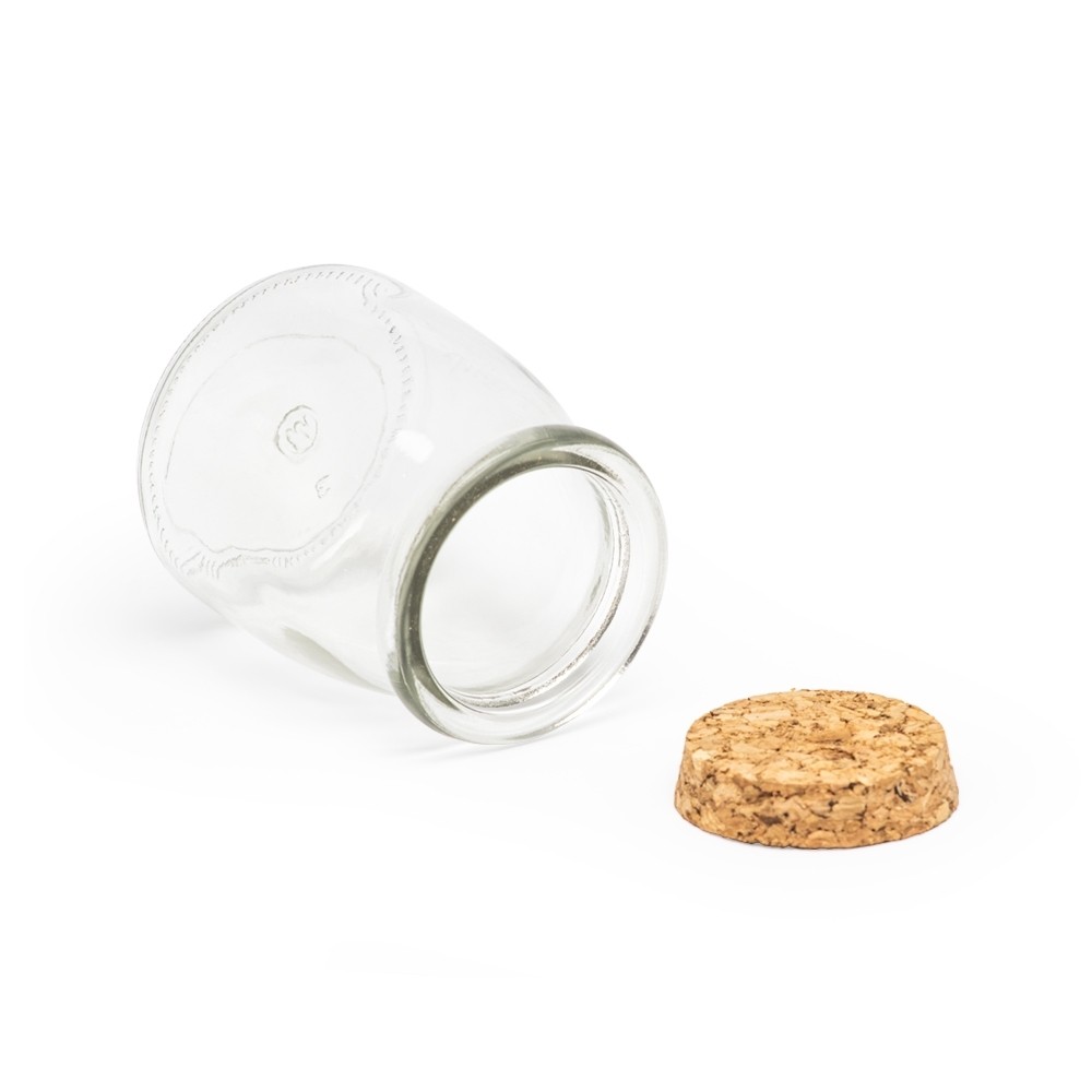 Frasco de vidro com capacidade de 200ml, tampa de cortiça.