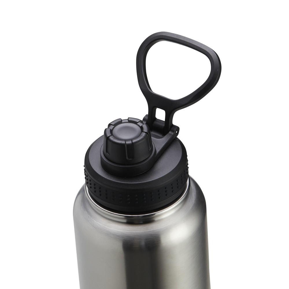 Garrafa térmica com capacidade de 1 litro em inox com parede dupla, contém tampa plástica rosqueável com bocal e alça para transporte acoplados.