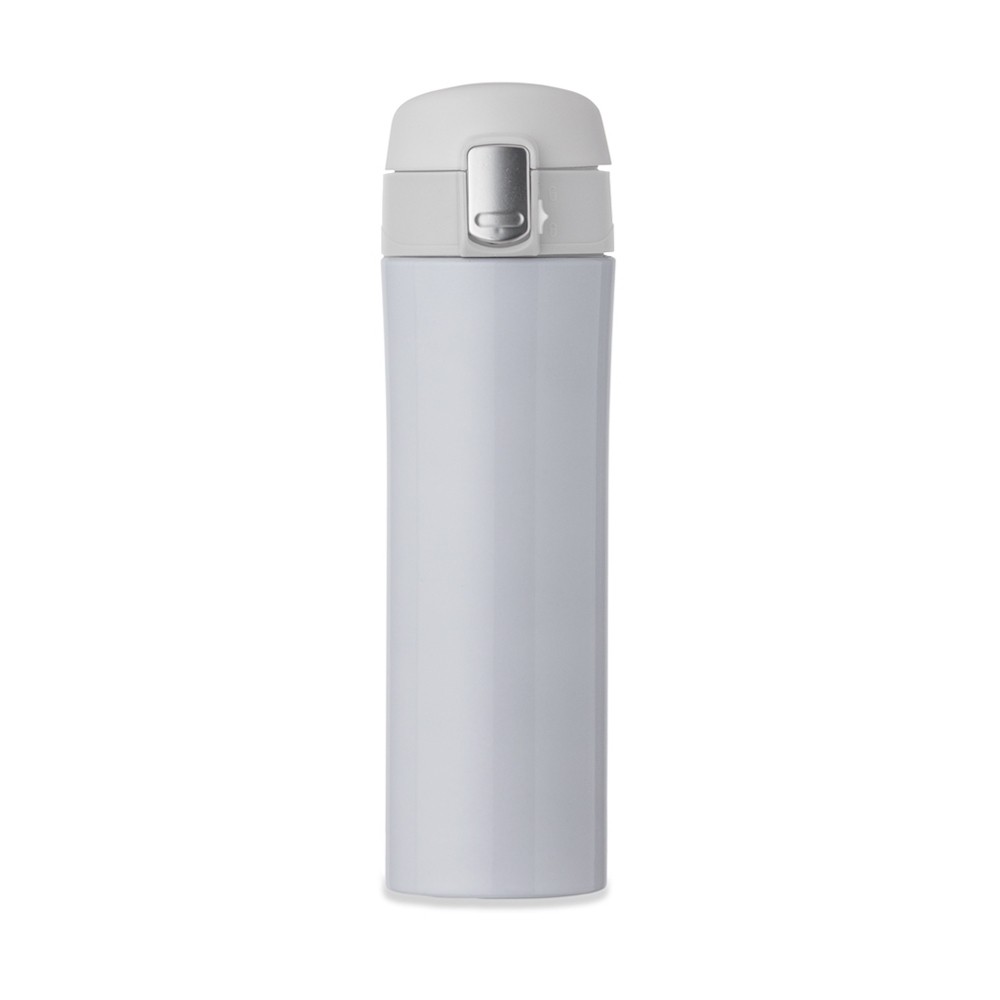 Garrafa térmica 450ml colorida com sistema de trava. Material metálico com revestimento interno em inox, possui tampa plástica fosca com borracha interna para vedação evitando o vazamento de líquido e prezando sua temperatura; possui botão central para abertura e trava lateral(basta seguir a orientação dos desenhos de cadeados simulando o travamento/destravamento da tampa). Especificações: - Medidas aproximadas para gravação(CxL)  18 cm x 6 cm - Tamanho total aproximado(CxL)  23,3 x 6,9 cm x 21,5 cm - Peso aproximado(g)  267
