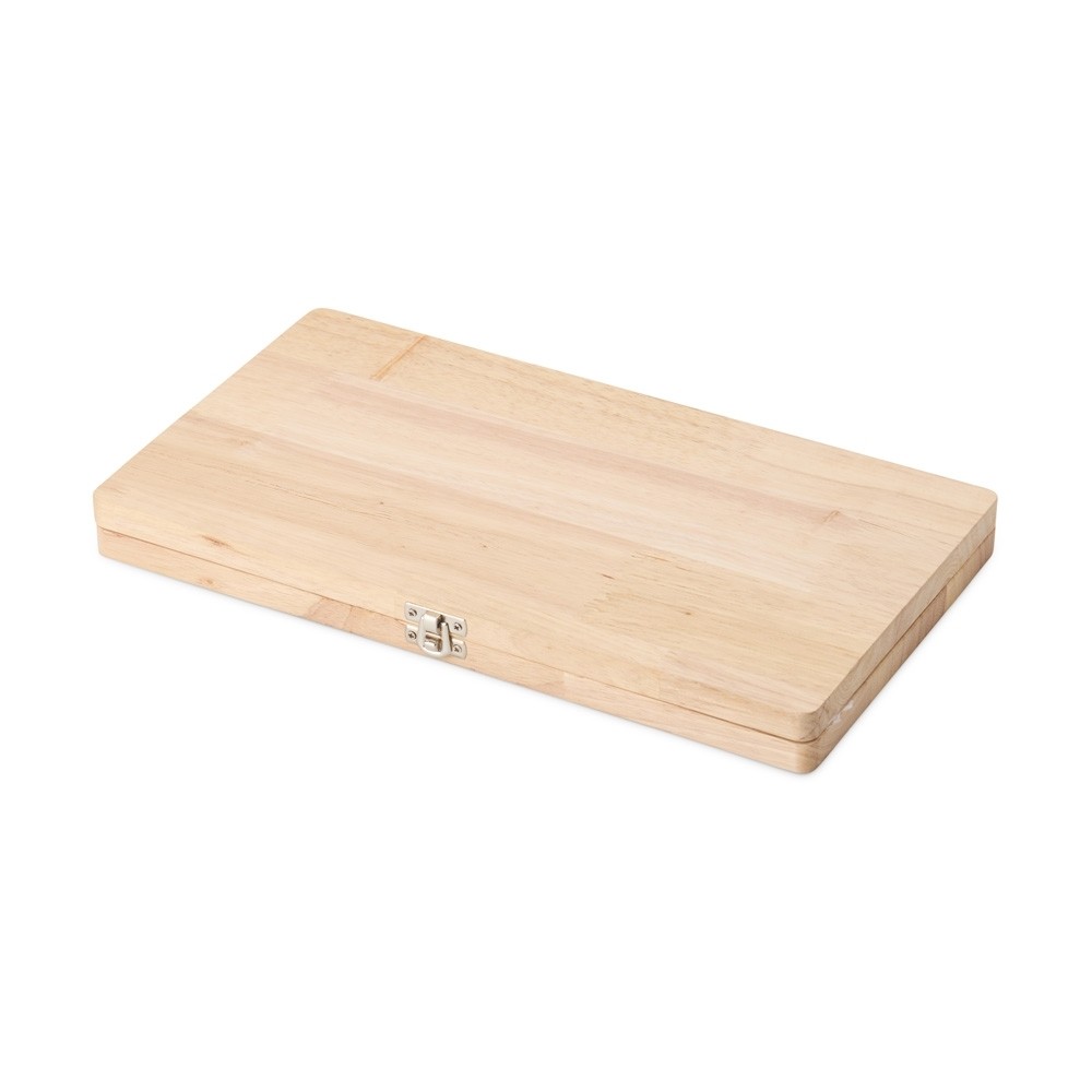 Kit churrasco 4 peças em estojo de madeira. Contém três facas e um garfo de inox com pegadores de madeira.