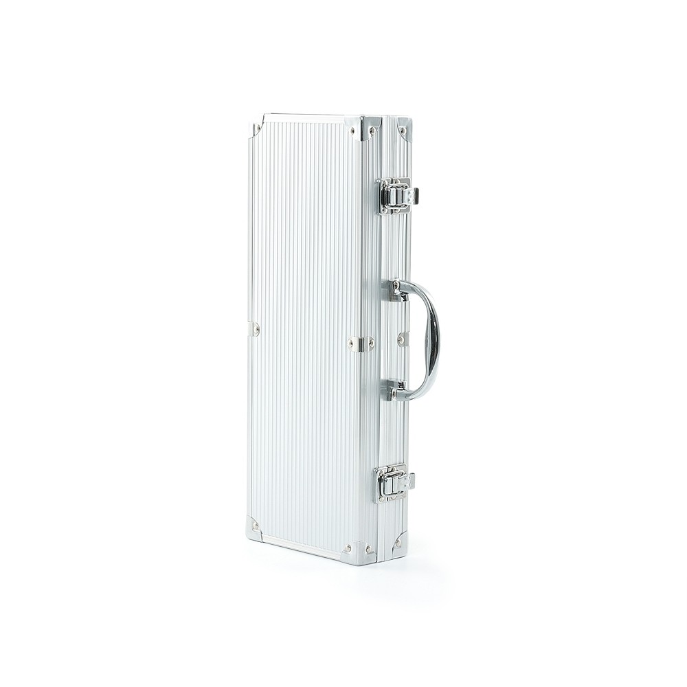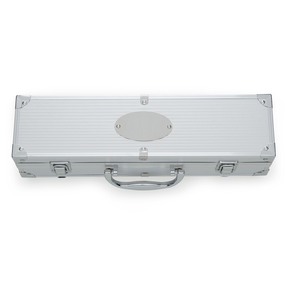 Kit churrasco 5 peças em maleta de alumínio com travas de segurança, contém três facas de corte, tesoura e chaira. Parte interna da maleta com revestimento em tnt e suportes de velcro para fixação das peças.