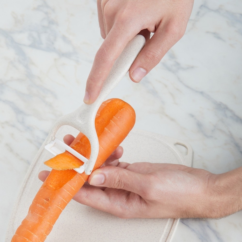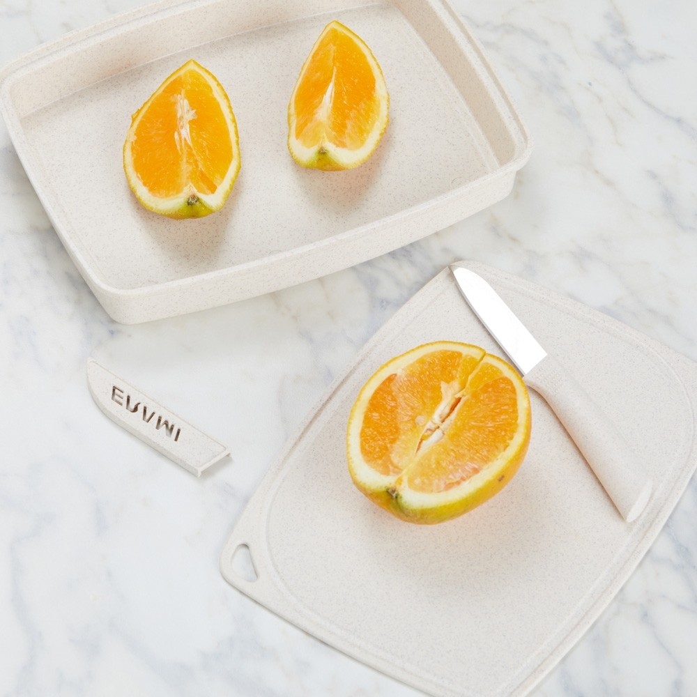 Kit Cozinha 3 Peças em plástico de palha de trigo e inox. Contém tesoura culinária, faca com protetor e descascador de legumes. Acompanha bandeja e tampa, podendo ser utilizada como recipiente e tábua para corte.