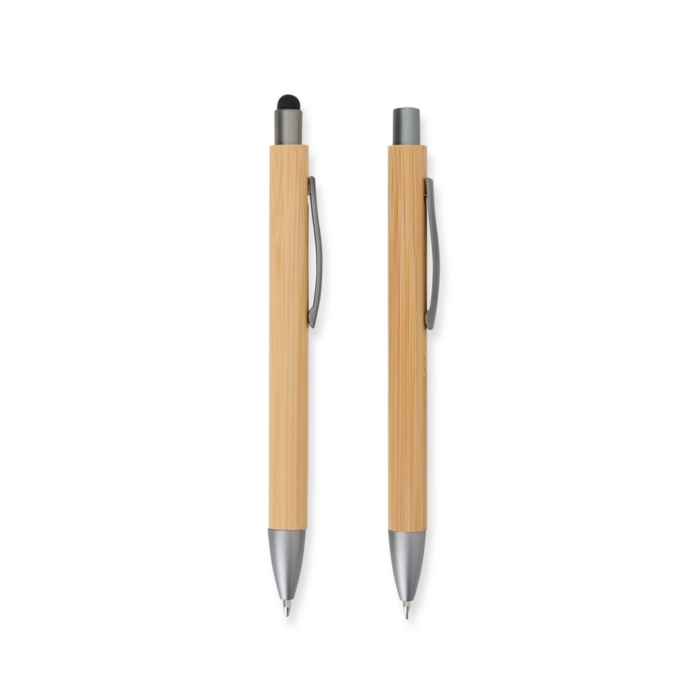 Nosso Kit Ecológico de Caneta e Lapiseira de Bambu é excelente para quem busca um toque sustentável no dia a dia. A lapiseira possui acionamento por clique, e a caneta conta com carga esferográfica azul de 1.0mm e função touch para quem precisa de toques precisos em dispositivos. Além disso, acompanha uma embalagem que imita bambu. Uma ótima escolha para presentes corporativos ou para quem ama escrever sem abrir mão da consciência ecológica! Especificações: - Largura  4 cm - Profundidade  2 cm - Comprimento  17 cm - Medidas aproximadas para gravação(CxL)  15,5 cm x 2,5 cm / Lapiseira 3,5 cm x 0,5 cm / Caneta 3,5 cm x 0,5 cm - Tamanho total aproximado(CxL)  Caneta 14,2 cm x 1,3 cm/ Lapiseira 13,9 cm x 1,3 cm - Peso aproximado(g)  39