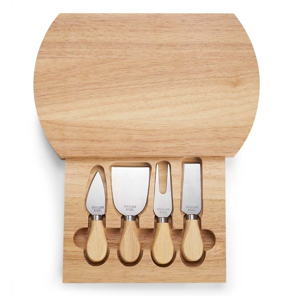 Kit queijo 5 peças, contém: tábua de bambu com gaveta para acomodação dos utensílios, faca com ponta, faca reta, garfo e espátula. Especificações: - Altura  18 cm - Largura  27,7 cm - Espessura  3,5 cm - Medidas aproximadas para gravação(CxL)  Tábua 16 cm x 22 cm - Cabo 2 cm x 2,5 cm - Peso aproximado(g)  1070