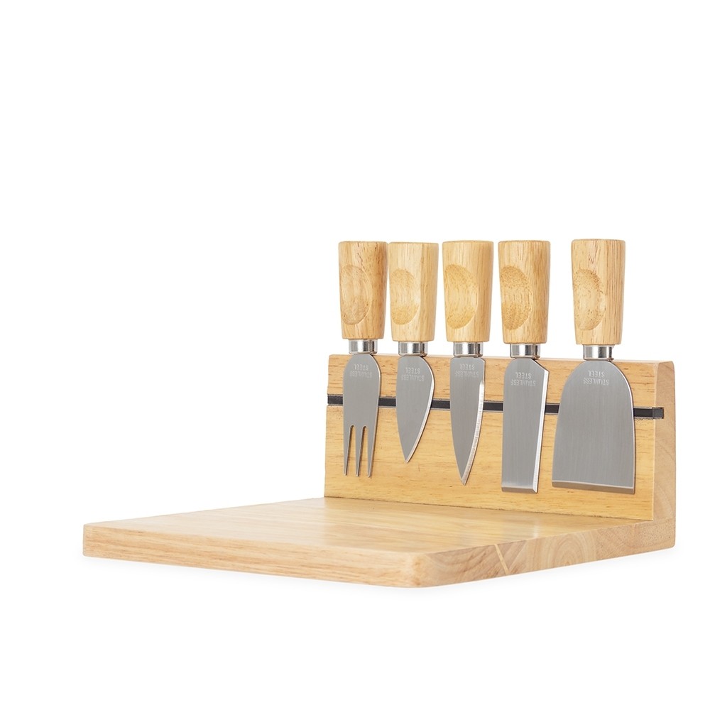 Kit queijo bambu 6 peças, contém: faca reta com ponta, faca com ponta, faca reta, garfo, espátula e tábua de bambu. Há uma linha imãtizada no centro da tábua para posicionar as peças, parte inferior com borrachas anti-deslizantes.