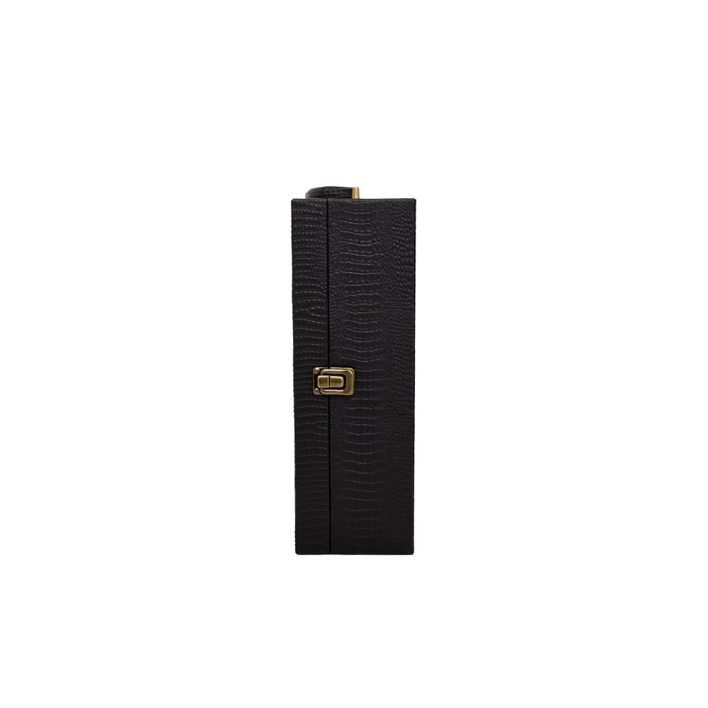 Kit vinho 4 peças em maleta de couro sintético texturizada. Contém saca-rolhas metálico, bico condutor com tampa, cortador de lacre e wine collar. Maleta com alça, trava de segurança e plaquinha plástica fixa com fita dupla face. Área interna revestida de veludo com suportes de nylon com velcro e duas repartições para garrafas.