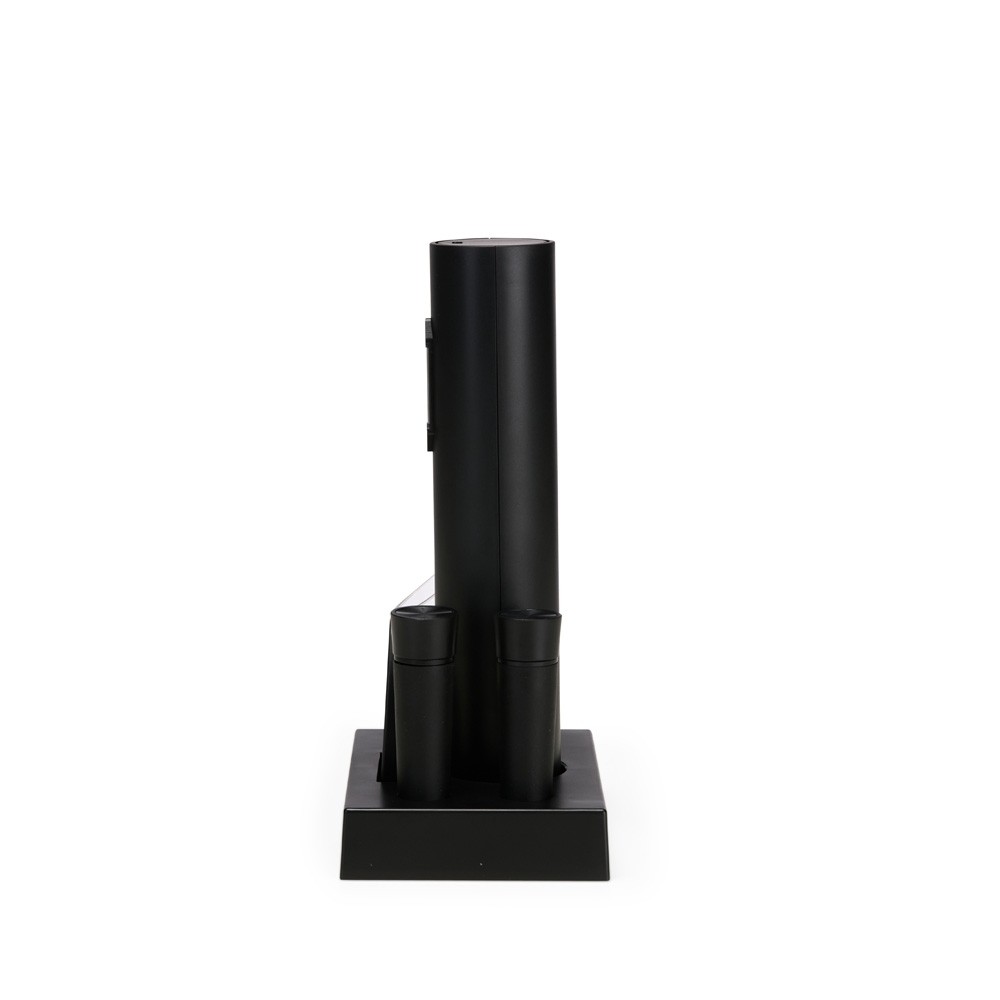Kit vinho com seis peças, incluindo saca-rolhas recarregável com acionamento por botões, bico dosador, duas rolhas plásticas, cortador de lacre e base organizadora. Acompanha cabo USB-C.