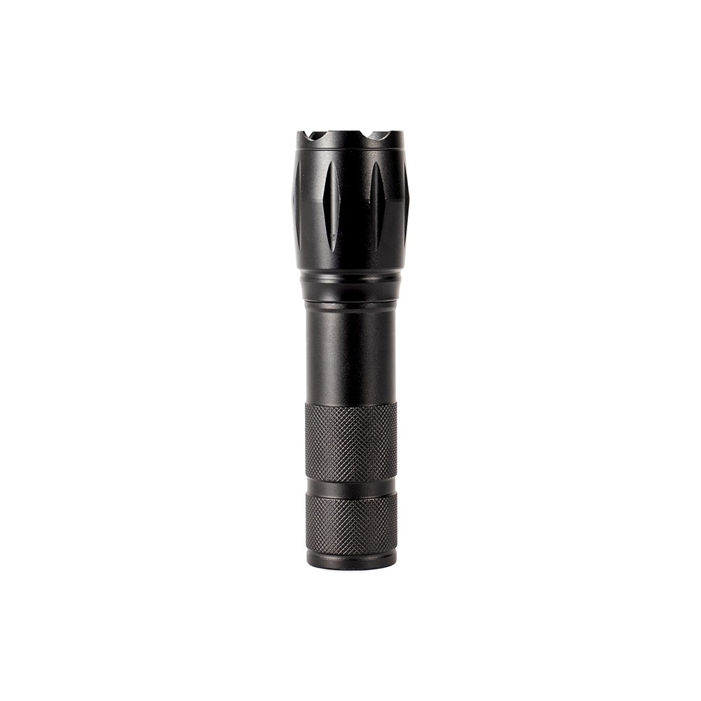 Lanterna recarregável em LED com estrutura metálica. Possui mecanismo de ajuste de zoom, três níveis de luz, botão liga/desliga e entrada USB-C para recarga. Acompanha cordão de nylon e cabo USB-C.