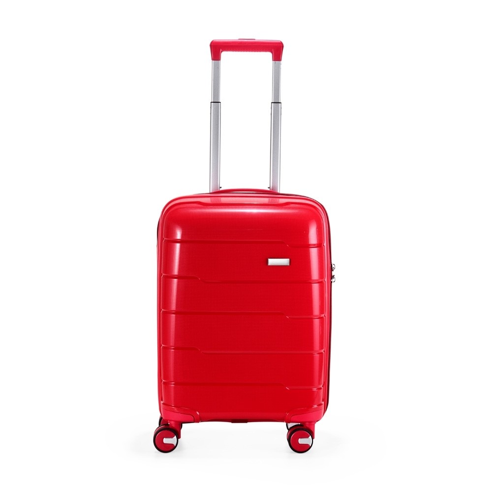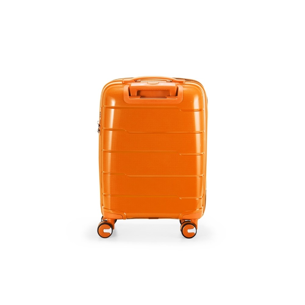 Mala de bordo 45 litros em plástico PP (casca dura), contém cadeado numérico TSA. Compartimentos com bolso telado e cinta compressora para roupas. A mala possui duas alças de mão, puxador retrátil com regulagem de tamanho, quatro rodinhas 360º e apoios laterais. Acompanha placa para personalização.