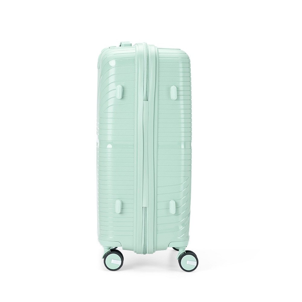 Mala de viagem em plástico resistente com capacidade de até 67 litros. Possui espaço interno com divisória, que contém bolso em tela e outro espaço com cinta compressora para organização de objetos. Conta com duas alças de mãos, uma superior e outra lateral, quatro apoios laterais, quatro rodinhas com giro em 360º, puxador com ajuste de nível e cadeado numérico TSA.