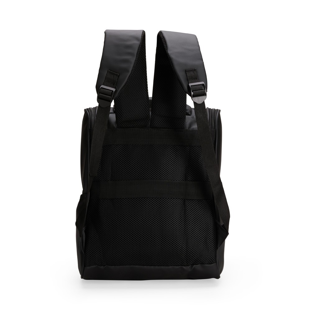 Mochila confeccionada em couro sintético impermeável com capacidade de até 18 litros. Possui compartimento interno para notebook de até 13 polegadas. Apresenta compartimento frontal com par de fivelas e fechamento em botões magnéticos, além de dois bolsos laterais. Possui área das costas e alças de mão e de costas com revestimento em tecido respirável.