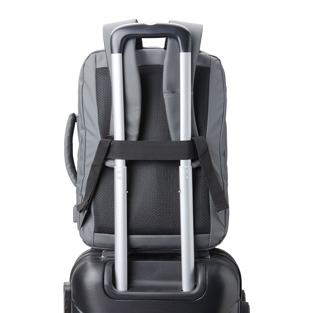 Mochila em couro sintético 25 litros resistente à água com quatro compartimentos, sendo o principal com bolso para notebook 15,6 e tablet 10. Com divisórias internas para acessórios, a mochila possui suporte externo usb, alça para encaixe em malas de viagem e duas alças de mãos, sendo uma delas lateral para o transporte da mochila no modo pasta.