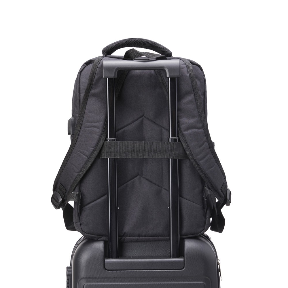 Mochila de nylon 20 litros com três compartimentos, sendo o principal com bolso para notebook 15,6. Com bolsos laterais e faixa frontal refletiva, a mochila possui adaptador USB externo, alça para encaixe em malas de viagem, duas alças de mãos e alças para as costas com revestimento espumado. Acompanha plaquinha metálica.