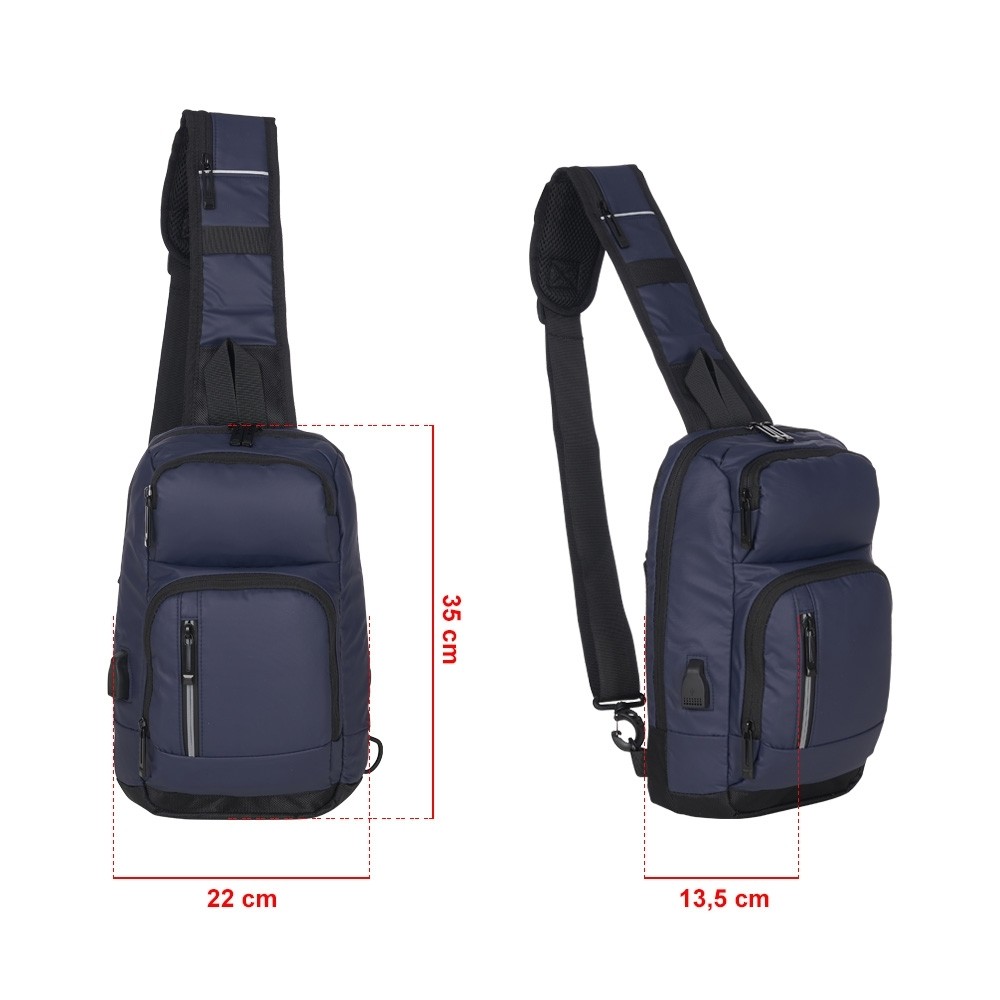 Mochila de ombro 8 litros em couro sintético resistente à água com seis compartimentos, sendo dois deles exclusivos para cartões e proteção contra furto. Contém suporte externo usb, bolso para tablet 9, bolsos internos, faixa refletiva e revestimento costado espumado.