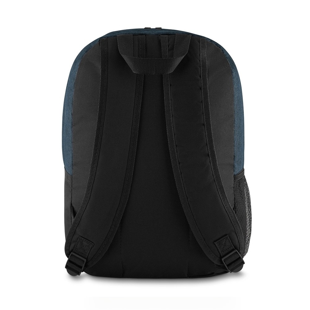 Mochila de poliéster com compartimento principal superior e compartimento frontal com abertura lateral. Contém um bolso de nylon na lateral, alça de mão em nylon e alças ajustáveis para as costas.