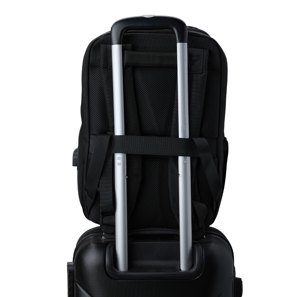 Mochila confeccionada em Nylon 22 litros com detalhes em couro sintético. Contém 5 compartimentos, sendo um bolso com faixa refletiva, divisórias internas para acessórios, bolso para tablet e notebook 15.6, bolso antifurto nas costas, bolso externo na lateral com elástico, suporte externo USB, alça para encaixe em malas de viagem, alças da mochila possuem bolsos integrados para suporte de óculos e cartões.