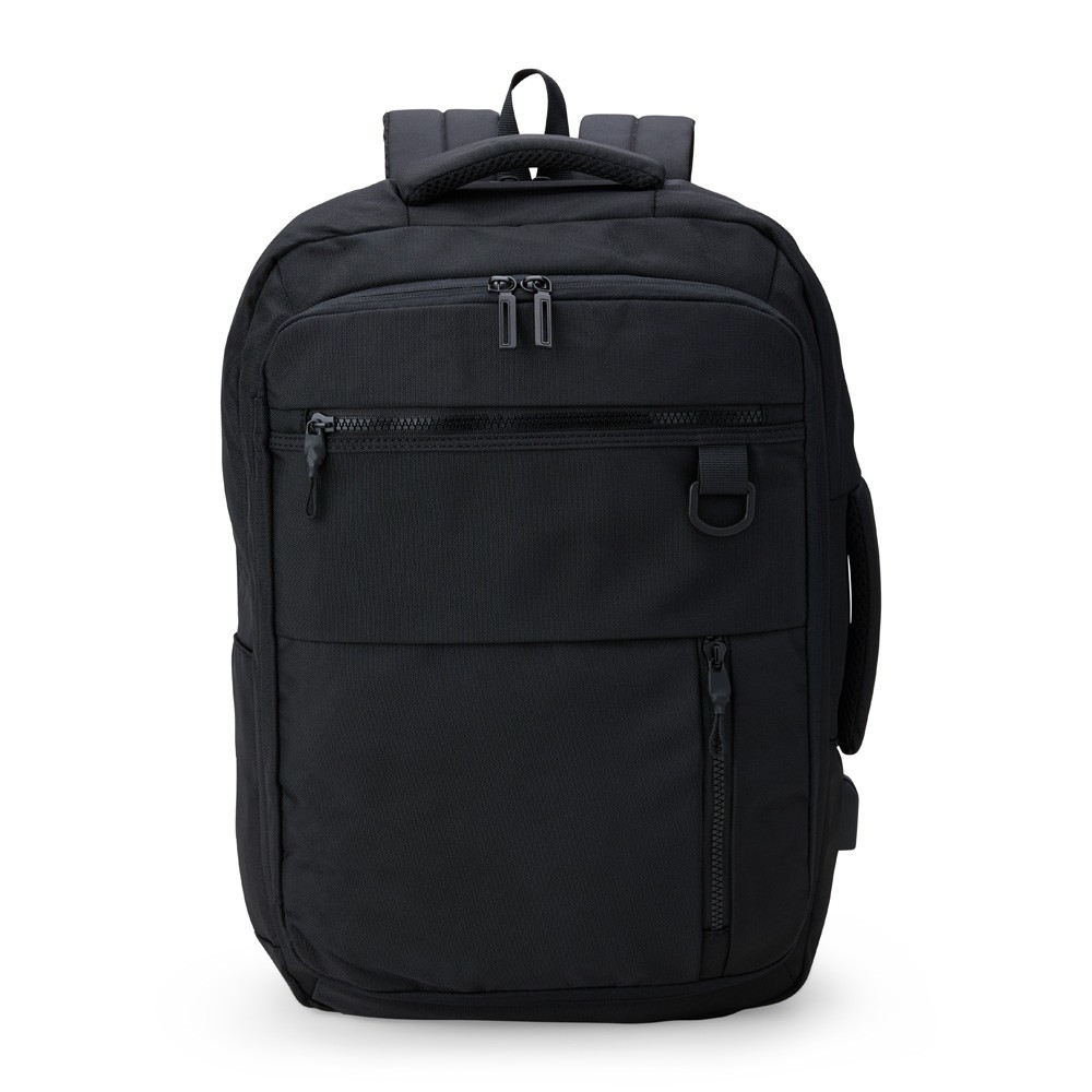 Mochila impermeável confeccionada em Oxford com revestimento em PU e capacidade para até 23 litros. Possui compartimento interno principal com divisória para notebooks de até 15,6 polegadas. Conta ainda com revestimento em espuma respirável na região das costas, nas alças de ombro e na alça superior de mão, além de dois compartimentos frontais em tamanhos diferentes e dois bolsos laterais com elástico e alça para encaixe em malas de viagem.