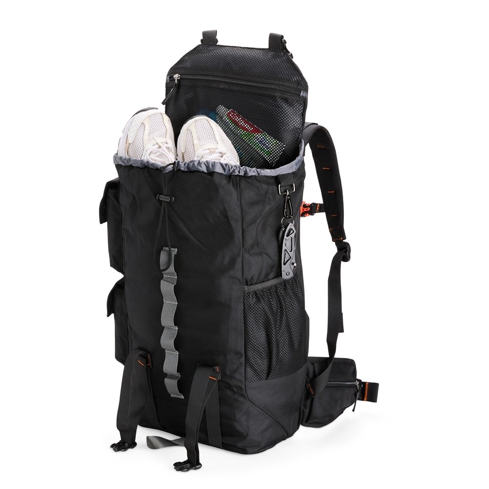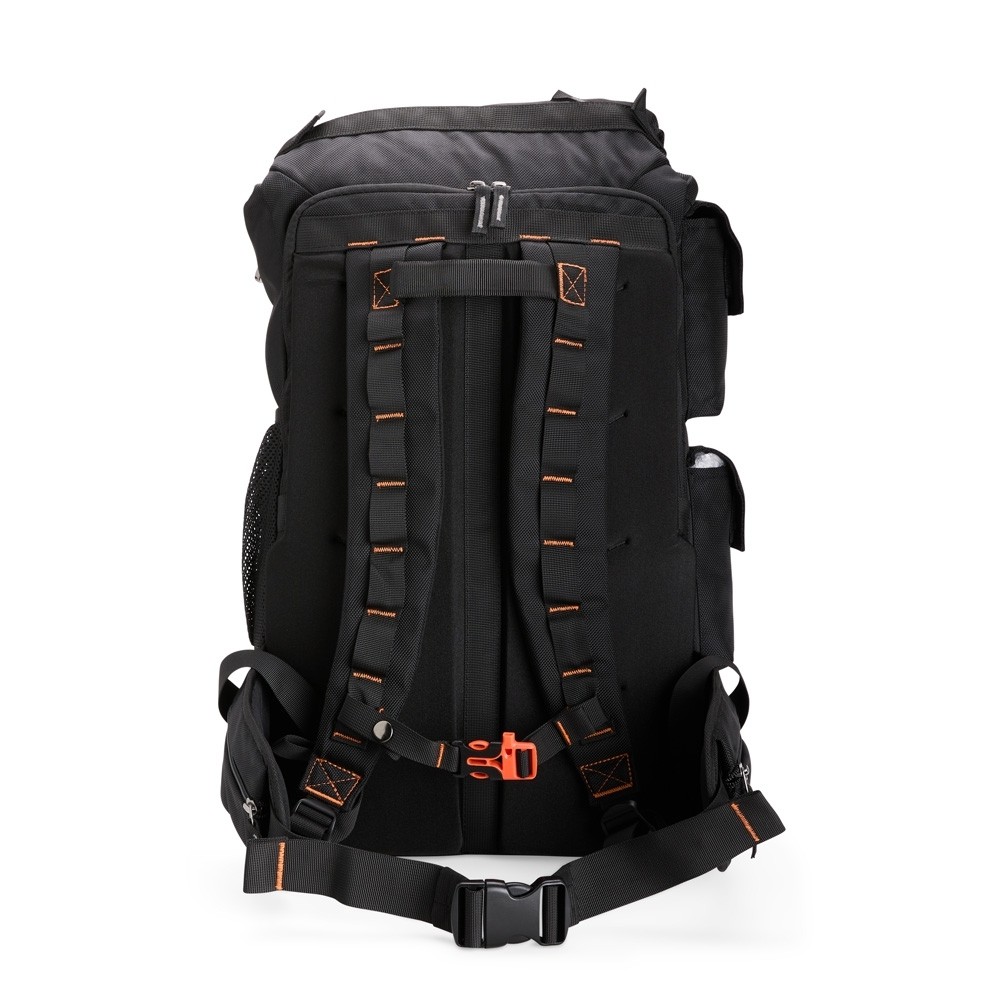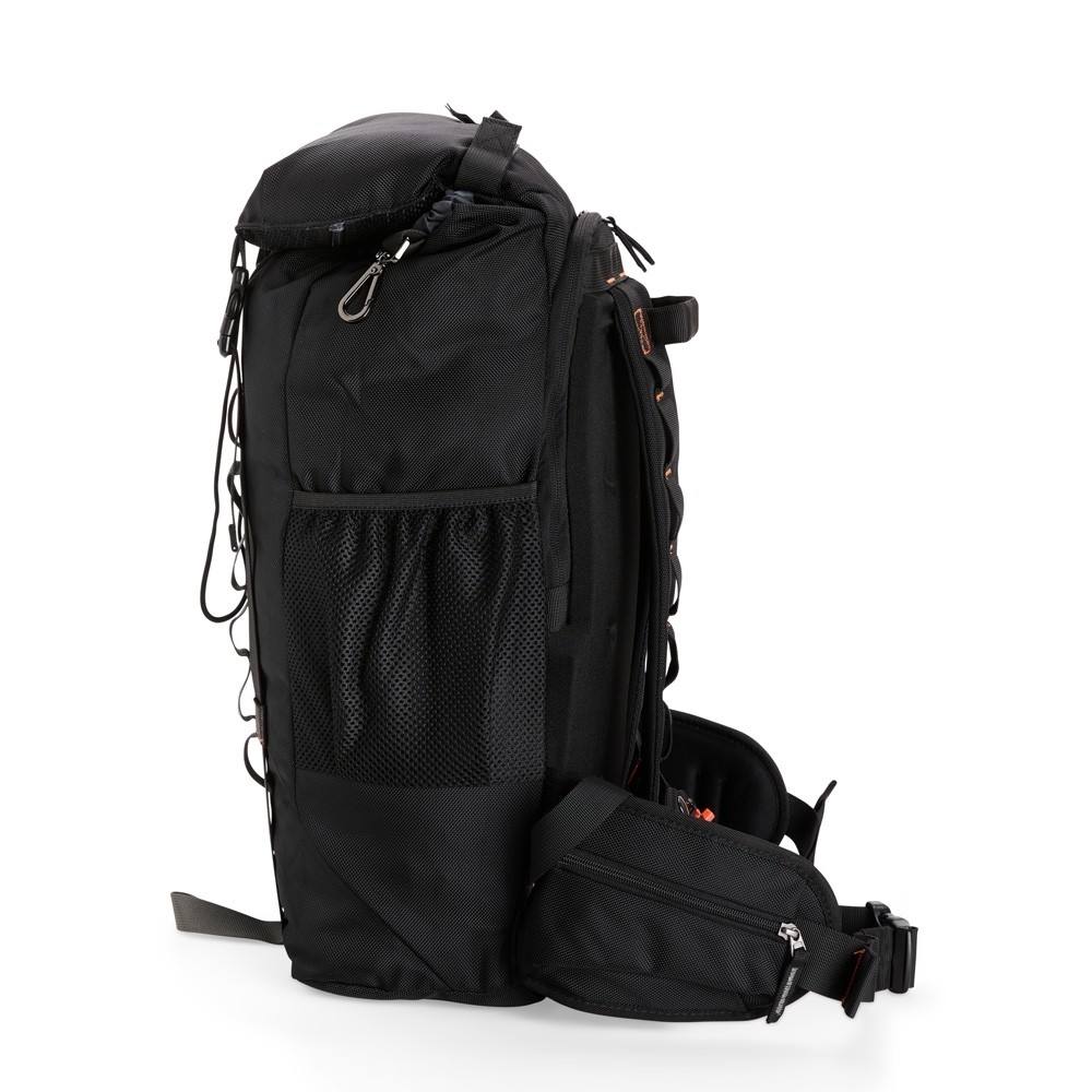 Mochila confeccionada em poliéster impermeável, fechamento por cordão e engate rápido plástico e capacidade máxima de 25 litros. Possui amplo espaço interno com divisória com fechamento em velcro e bolso em tela de nylon próximo à abertura. Apresenta três compartimentos externos: um com fechamento em zíper e dois em velcro nas laterais, além de um bolso lateral em tela de nylon. A parte traseira da mochila conta com outros três compartimentos em diferentes tamanhos, incluindo espaço para notebooks de até 15,6 polegadas.