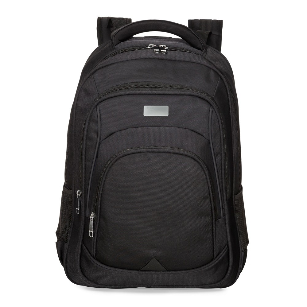 Mochila confeccionada em poliéster impermeável com capacidade máxima para 27 litros. Possui três compartimentos, um deles com bolso para notebooks de até 15,6 polegadas. Conta ainda com bolsos laterais em malha, alça para encaixe em malas de viagem, alças de compensação, duas alças de mãos e área costada com revestimento espumado. Acompanha plaquinha metálica para personalização.