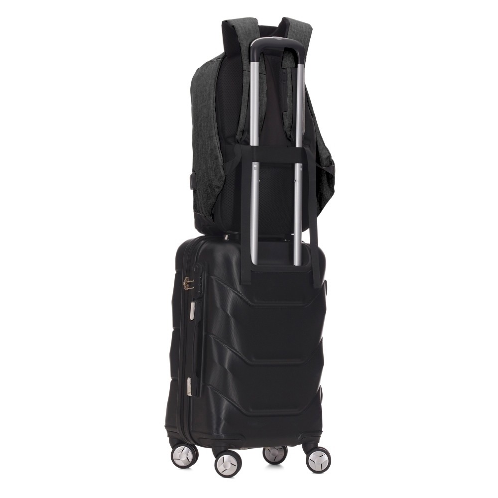 Mochila anti-furto de poliéster. Pensando na segurança do usuário foi confeccionado o compartimento principal na área traseira, impossibilitando a abertura do produto mesmo com a mochila na costa do usuário. Possui dispositivo com entrada USB na parte externa com cabo USB acoplado internamente; permitindo a conexão de um carregador portátil na área interna e a conexão de um eletrônico na área externa, viabilizando a carga e utilização do eletrônico enquanto caminha. Área interna do compartimento principal: bolso para notebook de 15,6 polegadas, bolso para tablet, quatro bolsos para acessórios, possui nas laterais internas sistema de velcro, maximizando a segurança da mochila. Parte frontal com faixa refletiva, alças para as costas ajustáveis revestidas com espuma para um maior conforto sendo uma delas com bolso de zíper, alça para mãos e alça horizontal para encaixe em malas de viagem.