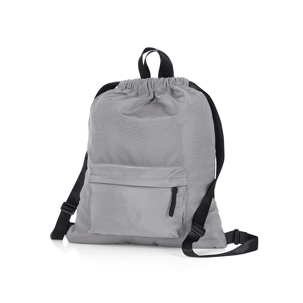 Mochila saco feita em poliéster resistente à água com alças reforçadas de nylon. Possui ainda um bolso frontal com fechamento em zíper.