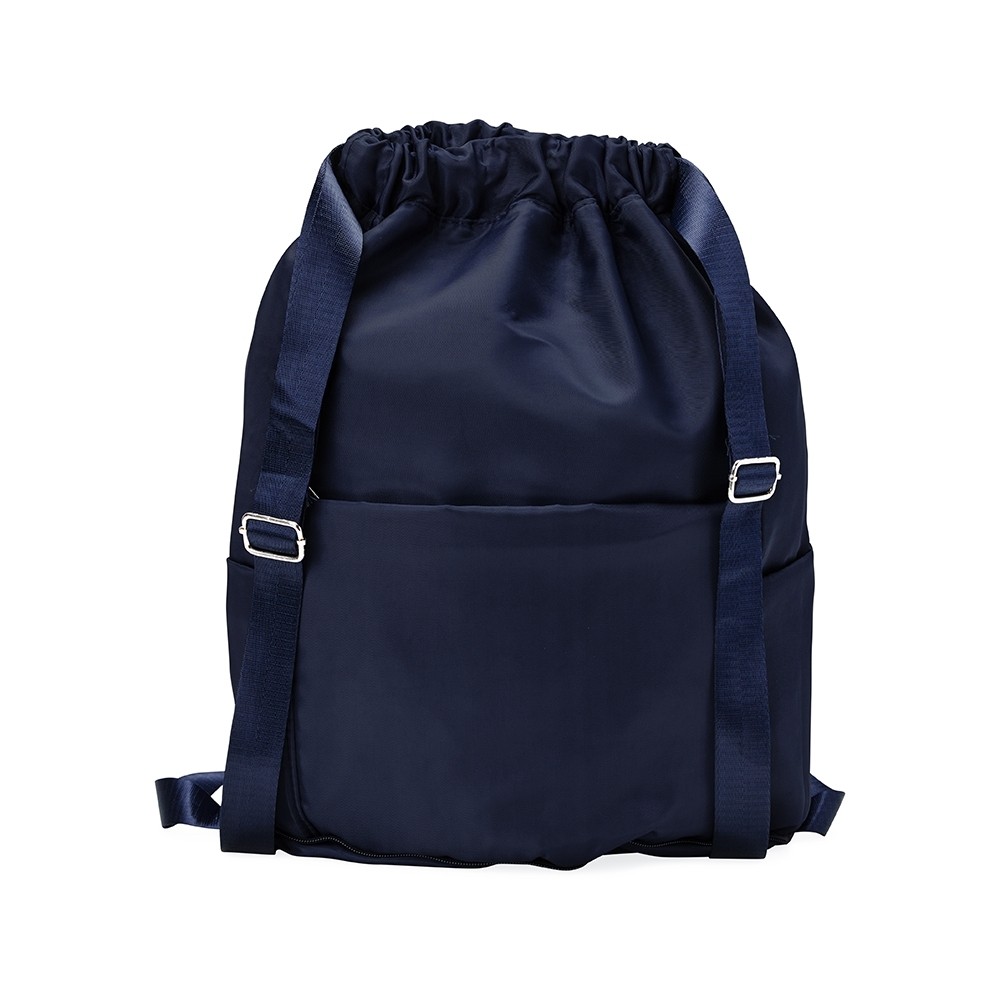 Mochila saco confeccionada em poliéster impermeável com alças em nylon reguláveis. Dispõe de três compartimentos em tamanhos diferentes, incluindo dois bolsos laterais e um bolso interno para itens molhados