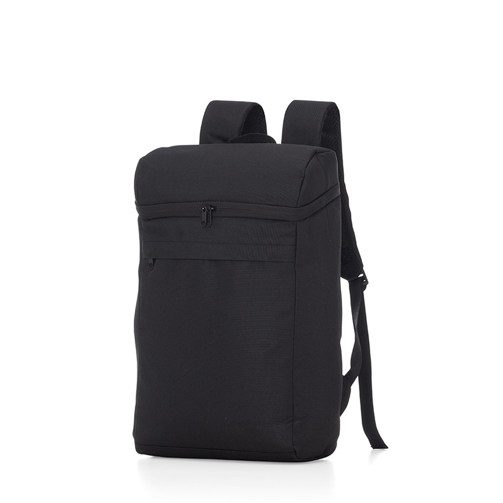 Mochila térmica 17L confeccionada em poliéster, possui bolso frontal com zíper, alça para as mãos em nylon, e alça para as costas ajustáveis com revestimento antitranspirante.