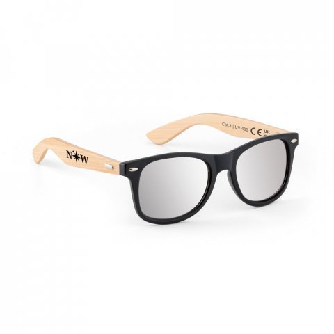 Óculos de sol em PP e bambu Óculos de sol com armação em PP e bambu. Lentes espelhadas de categoria 3 e UV400 de proteção. Em conformidade com as normas EN ISO 12312-1. A cor e o resultado da impressão nos materiais naturais pode variar entre produtos. 146 x 49 x 150 mm