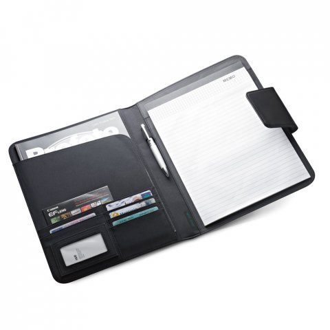 Pasta A4 em c. sintético e 1680D com fecho magnético. O interior contém um bloco de 40 páginas pautadas, suporte para esferográfica (não inclusa) e vários bolsos. Placa disponível para personalização. 245 x 325 x 15 mm | Chapa: 45 x 15 mm