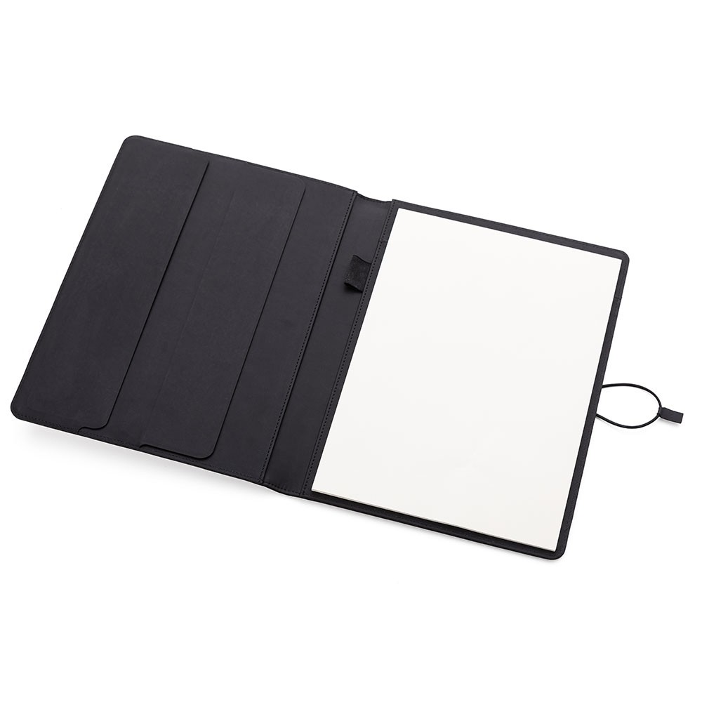 Pasta convenção com capa almofadada em tecido de poliéster. Contém 20 folhas para anotação, porta canetas, porta documentos e porta cartão internos. Possui elástico lateral com detalhe em couro sintético para fechamento da pasta.