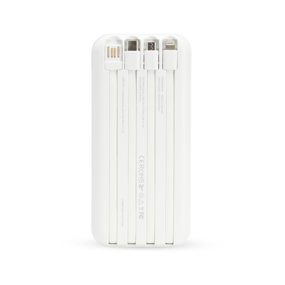 Carregador portátil power bank com 10.000mAh e carregamento via indução ou via cabo. Com display digital indicador de bateria, o carregador contém quatro cabos acoplados: Lightning, Tipo-C, V8 e saída USB para o carregamento da própria bateria. Portas de entrada: V8, Tipo-C e duas portas USB.