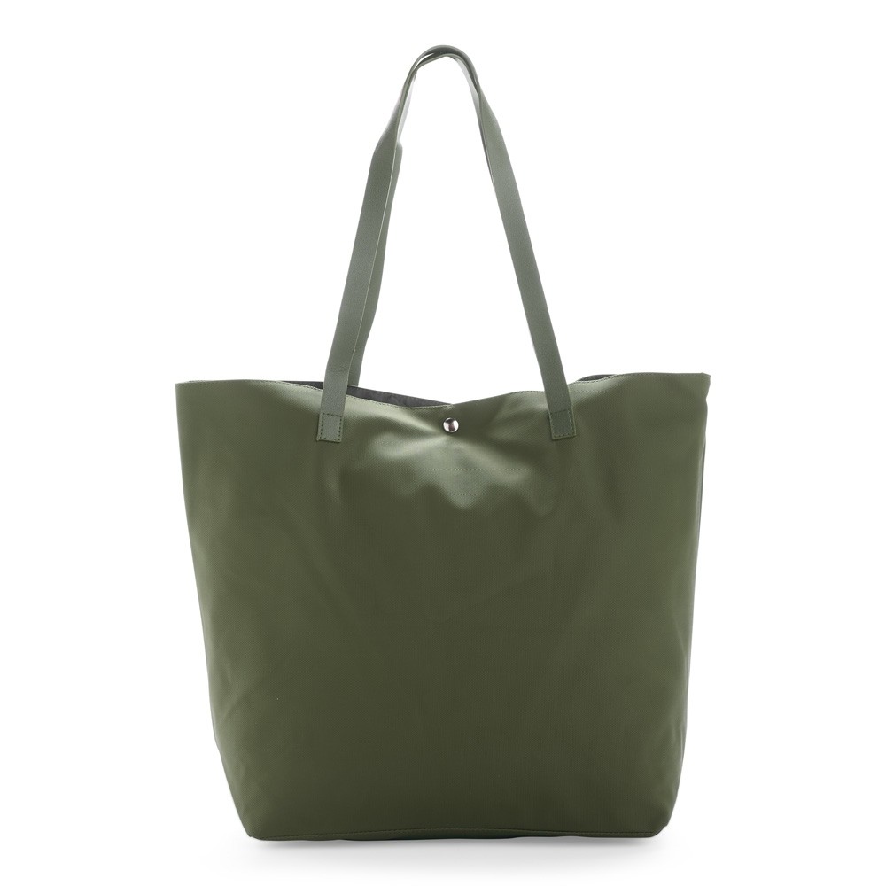 Sacola confeccionada em couro sintético à base de PVC com par de alças de costura externa e botões magnéticos metálicos para fechamento. Possui revestimento interno em poliéster e bolso compacto com fechamento em zíper.