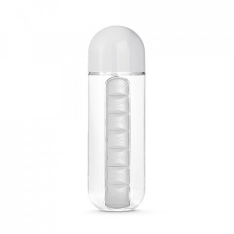 Squeeze em AS com tampa em PE 740 mL Squeeze em AS com tampa em PE, porta comprimidos em PP, com 7 divisórias e capacidade até 740 mL. Caixa branca 94658 vendida opcionalmente. Certificação EU Food Grade. ø75 x240 mm