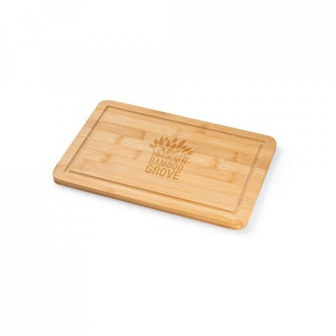 Tábua de corte em bambu, com ranhura para líquidos. Certificação EU Food Grade. A cor e o resultado da impressão nos materiais naturais pode variar entre produtos. 300 x 200 x 12 mm