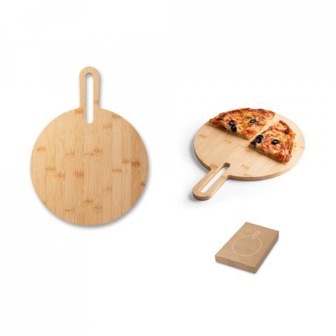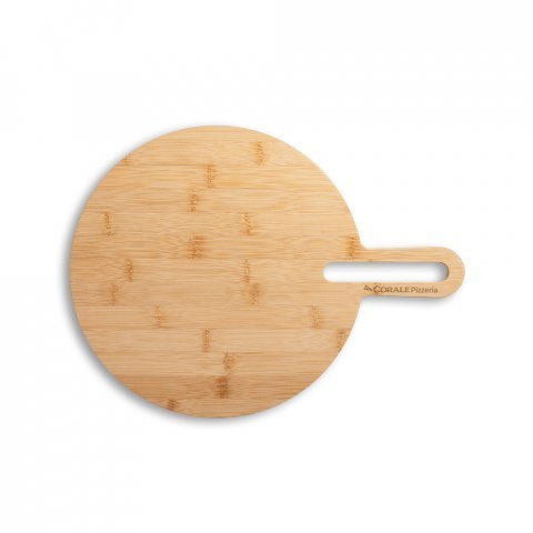 Tábua de servir em bambu com pega, de grande dimensão e de utilização versátil. Ideal para pizza. Fornecido em caixa presente de papel kraft reciclado. Certificação EU Food Grade. A cor e o resultado da impressão nos materiais naturais pode variar entre produtos. 408 x 310 x 12 mm