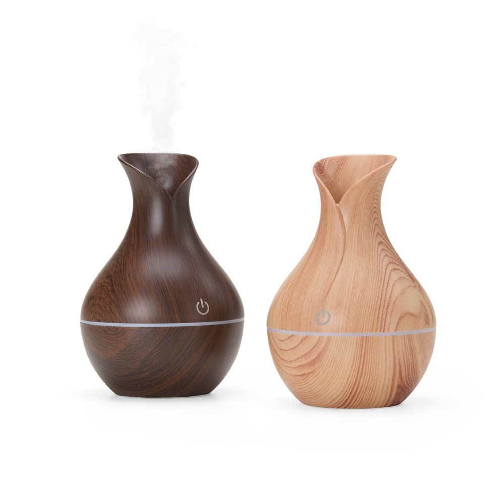 Umidificador com led de 7 cores com exibição alternada. Produzido em plástico estilizado em madeira com acabamento brilhante. Umidificador possui capacidade de até 150ml e funciona apenas a base de água. Acompanha filtro de algodão e um cabo USB. Obs.: A limpeza externa deve ser feita apenas com pano umedecido, caso submergir o produto o equipamento pode ser danificado.