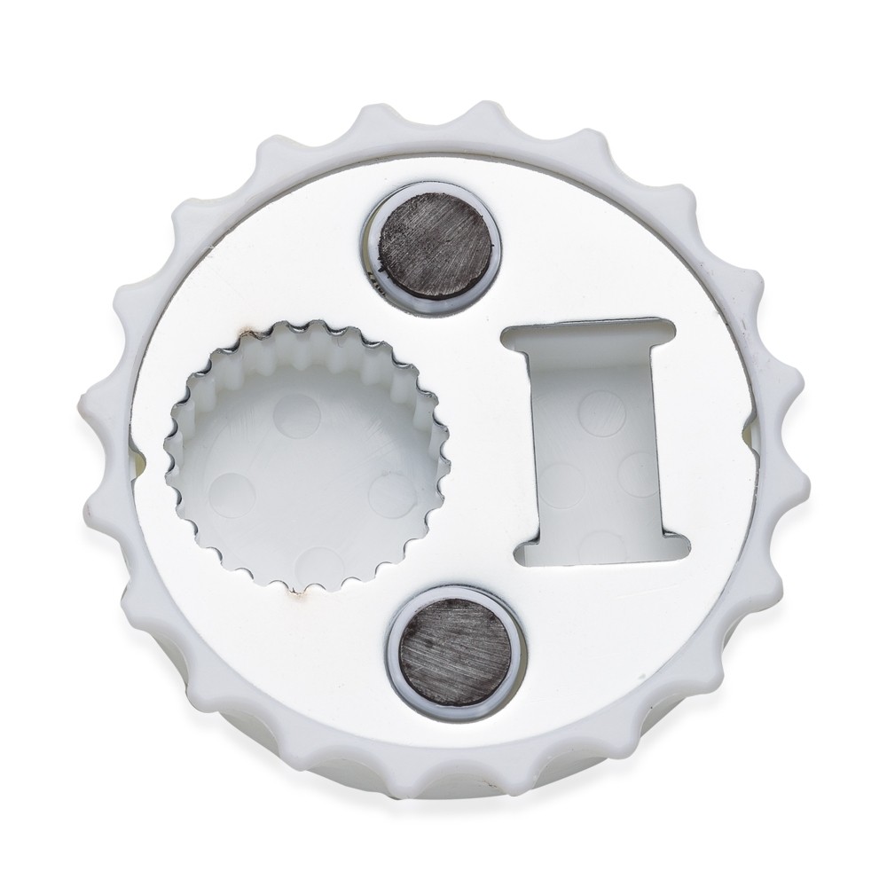 Abridor formato tampa de garrafa com imã para geladeira, contém dois tipos de abridores de garrafa.