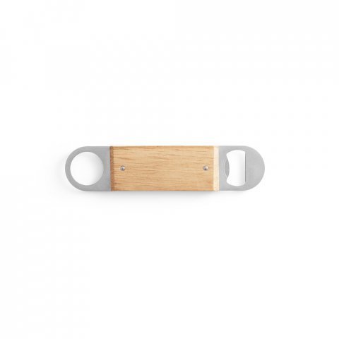 Abridor de garrafas em aço inox com corpo em madeira de faia. Distintivo dos restantes por conter um abridor de um lado e uma argola para facilitar sua arrumação. A cor e o resultado da impressão nos materiais naturais pode variar entre produtos. 40 x 180 x 10 mm
