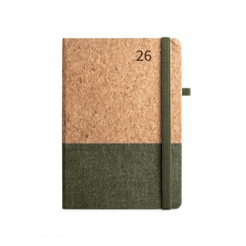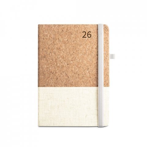 Agenda B5 em cortiça e linho. Possui um suporte para esferográfica (não inclusa), marcador em fita e elástico para fecho na mesma cor. Está organizada num plano diário (70 g/m²). Fornecida com bolsa de non-woven. 148 x 210 mm | Bolsa: 205 x 250 mm Agendas 2026 Novidades