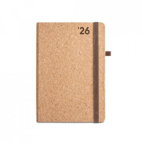 Agenda A5 em cortiça. Possui um suporte para esferográfica (não inclusa), miolo em cor marfim e marcador em fita. Está organizada num plano diário (70 g/m²). Fornecida em bolsa de non-woven. 148 x 210 mm | Bolsa: 205 x 250 mm Agendas 2026 Novidades