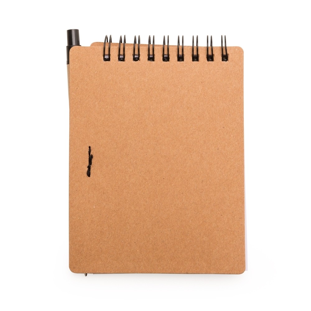 Bloco de anotações ecológico com caneta de papelão. Possui detalhe “smile” na capa frontal(verso liso), caneta ecológica com acabamentos em plástico acionada por clique, primeira folha(branca) com cinco blocos autoadesivos coloridos com aproximadamente 20 folhas cada, bloco amarelo com aproximadamente 20 folhas e 70 folhas brancas pautadas.