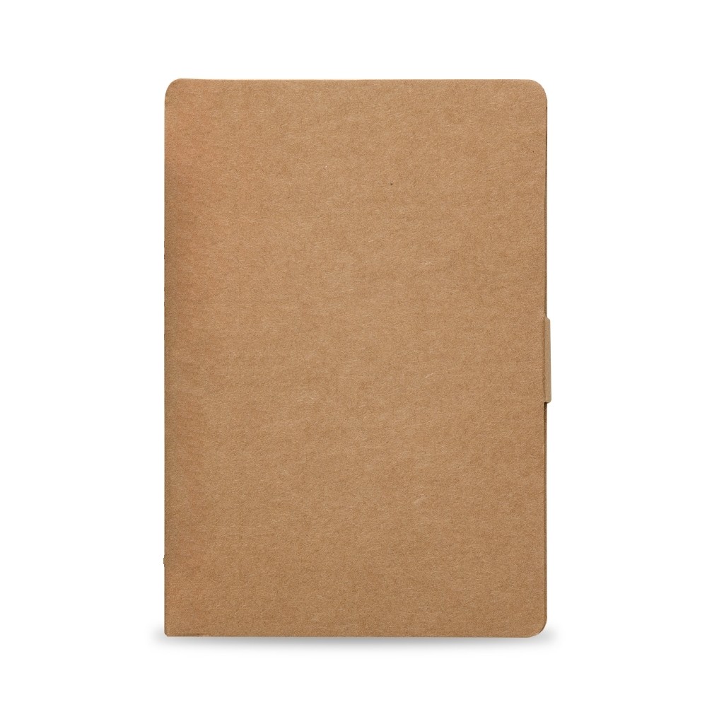 Bloco de anotações ecológico, material em kraft. Possui uma trava na própria capa, cinco blocos autoadesivos coloridos com aproximadamente 25 folhinhas , bloco autoadesivo amarelo com aproximadamente 25 folhas e bloco grande com aproximadamente 70 folhas. OBS.: IMAGEM MERAMENTE ILUSTRATIVA, não acompanha caneta!
