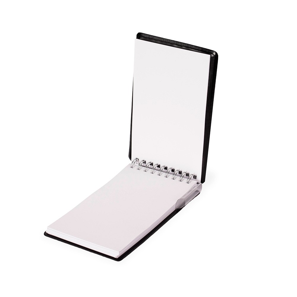 Bloco de anotações com capa em couro sintético, porta-canetas em plástico e encadernação Wire-O. Contém aproximadamente 100 folhas brancas sem pauta. Especificações: - Largura  9 cm - Comprimento  14,6 cm - Espessura  1,4 cm - Medidas aproximadas para gravação(CxL)  12 cm x 8 cm - Peso aproximado(g)  96
