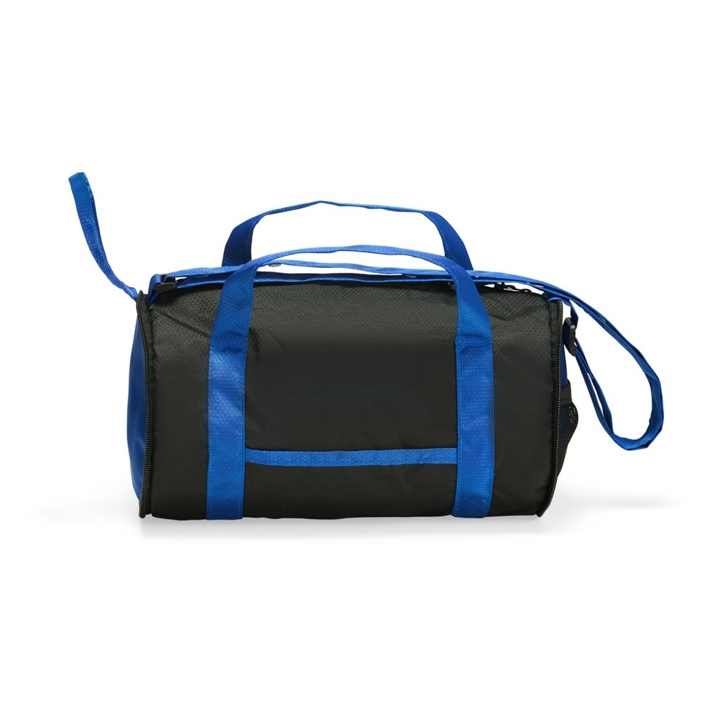 Bolsa esportiva em poliéster 420D resistente à água, com fechamento em zíper e capacidade de 6 litros. Quando dobrada, mantém formato arredondado com bolso telado e uma alça de mão para transporte. Aberta, possui dois bolsos externos: um frontal aberto e outro lateral em tela de nylon com elástico. Conta ainda com duas alças laterais fixas e uma alça transversal ajustável.