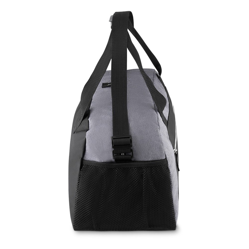 Bolsa esportiva de poliéster. Possui alça de mão com pegador cinza de velcro, alça ajustável para as costas e bolsos laterais de malha.