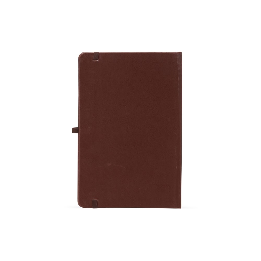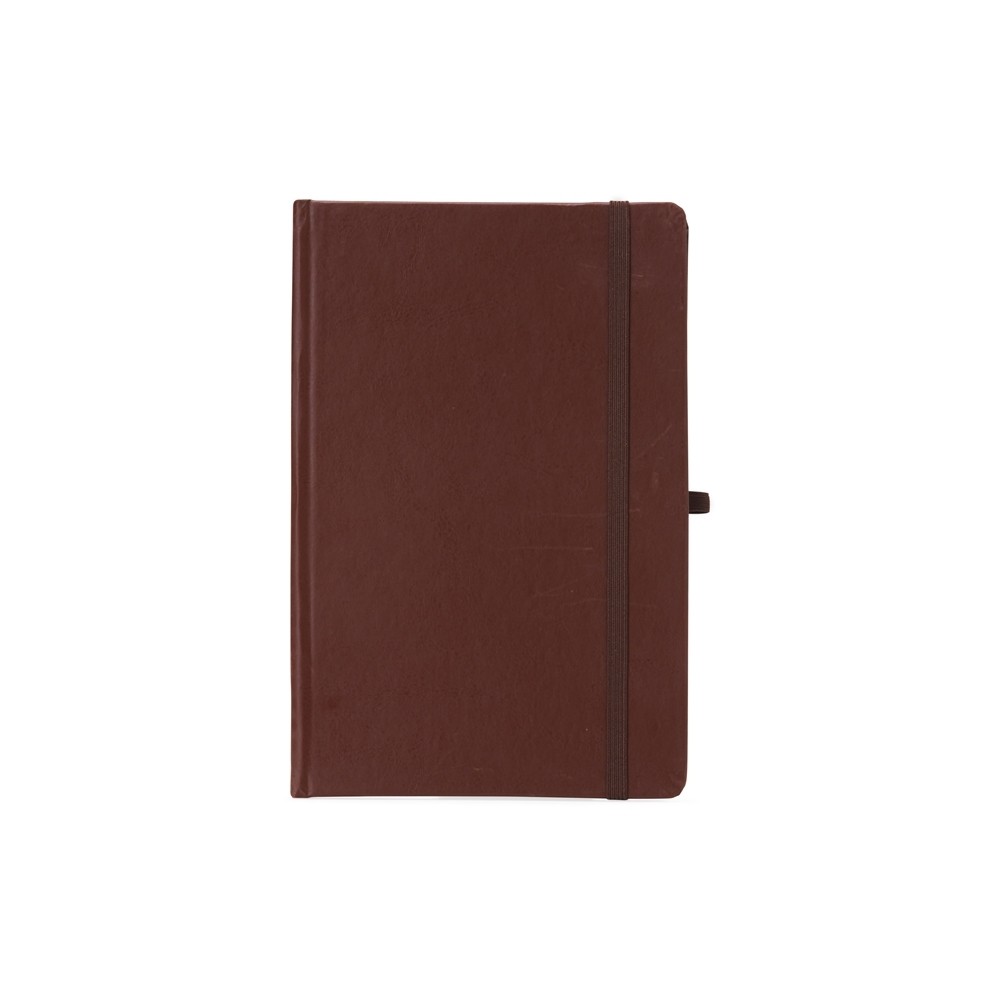 Caderneta de couro sintético com suporte para caneta, elástico para lacre e marcador de página em cetim, contém aproximadamente 80 folhas com pauta na cor branca.