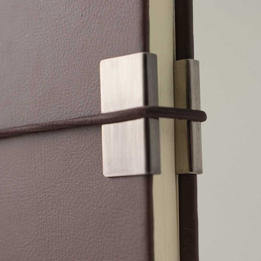 Caderneta em couro sintético com detalhe metálico, marcador de página em cetim e fita elástica para fechar. Contém aproximadamente 96 folhas marfim com pauta.